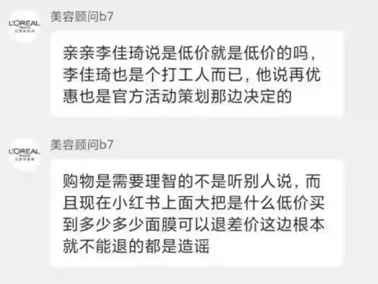 先是在头部主播直播间赚足了流量,引得消费者蹲点付定金抢货,转头却又在自家直播间放出了大额优惠券,这种言行不一的做法引发了消费者的不满,纷纷要求退还差价,欧莱雅客服却回应“李佳琦说的最低价不一定是最低价”,事件一度持续发酵。