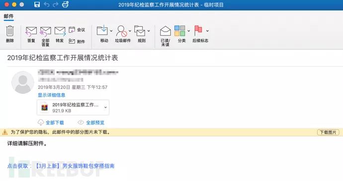 恶意文件投递的方式依然是最常用的鱼叉攻击的方式,钓鱼关键字包括”干部培训”,”绩效”,”工作方向”,”纪检监察”等,相关的邮件如下: