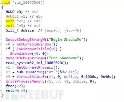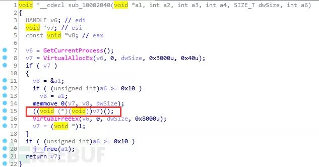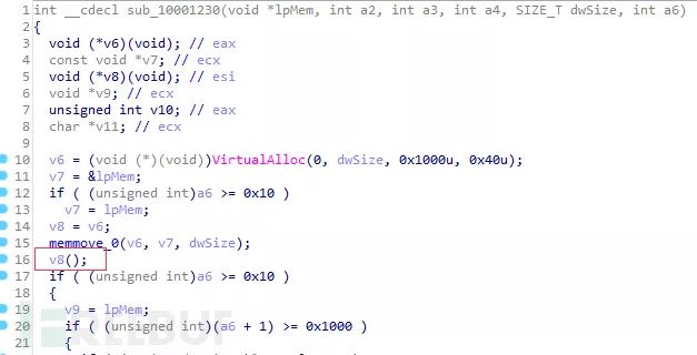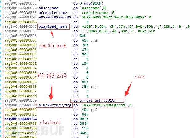 木马执行后分配内存空间,拷贝shellcode到新申请的空间中执行,shellcode的功能则是利用配置密码+本地计算机名的hash作为密钥解密最终的playload,并对playload进行校验,成功后创建新线程执行playload。