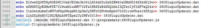 360PluginUpdater.bat的功能是输出加密脚本到360PluginUpdater.dat,完成后将其重命名为360PluginUpdater.js,并执行他: