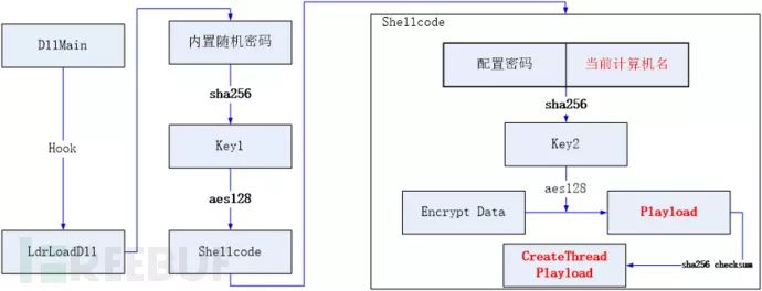 首先在dll入口点处hook LdrLoadDll函数,当调用该API时接管执行流程执行解密代码,通过内置的随机密码解密shellcode,shellcode的功能则是利用配置密码+本地计算机名的hash作为密钥解密最终的playload,并对playload进行校验,成功后创建新线程执行playload: