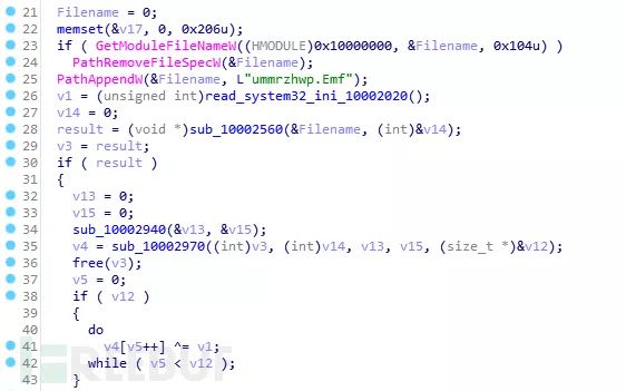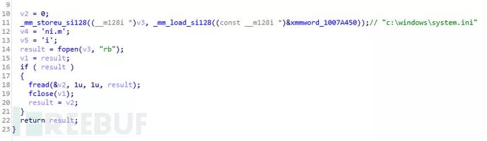 该样本会读取c:\windows\system32.ini文件,读取1字节作为key:
