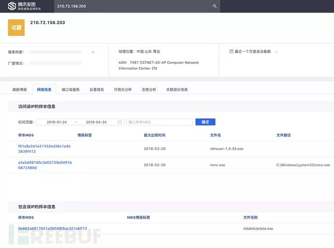 此外,在上段所述的加密的前缀中,我们还发现了一个ip:210.72.156.203做为加密前缀,我们从腾讯安图查询可见:
