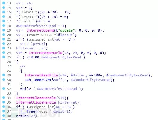 chrome_elf.dll功能除了实现调用原始默认程序打开txt、doc文件外,还会连接网络下载下一阶段的恶意文件并在内存中直接执行: