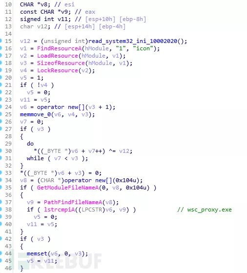 读取并解密资源icon下的1资源,得到一个字符串wsc_proxy.exe,比较当前进程是否为wsc_proxy.exe,如果是则继续: