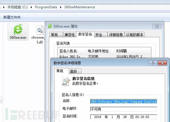 然后再次使用白加黑的技术,使用360se的主程序做为白文件,加载恶意的chrome_elf.dll: