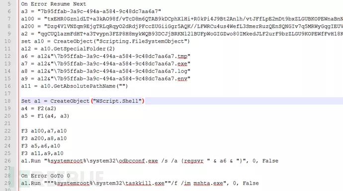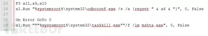 接着调用系统自带的odbcconf.exe,将7b95ffab-3a9c-494a-a584-9c48dc7aa6a7.tmp(dll文件)给加载起来。最后调用taskkill.exe,结束mshta.exe进程: