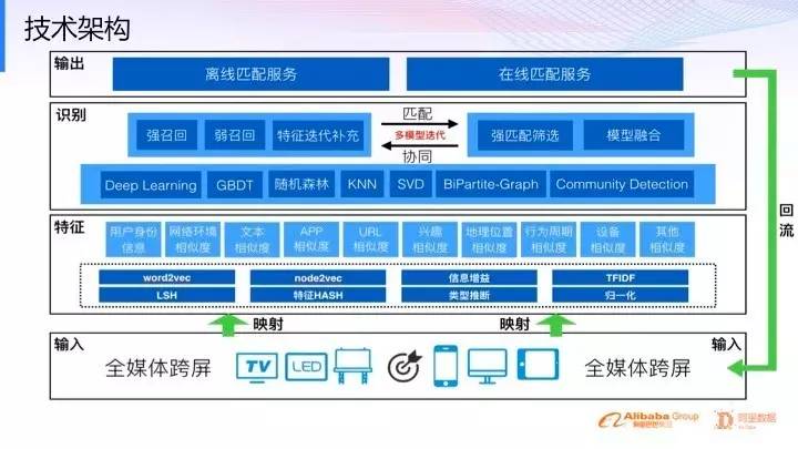 大家可以看到,整个技术体系都是,先把数据接进来,再通过一些机器学习或者深度学习的办法(像word2vec,node2vec,TFIDF,归一化等)处理特征层,之后映射到一些比较抽象的高纬度Level(比方说像用户的身份信息,网络的环境相似度,文本的相似度,APP相似度等等)。