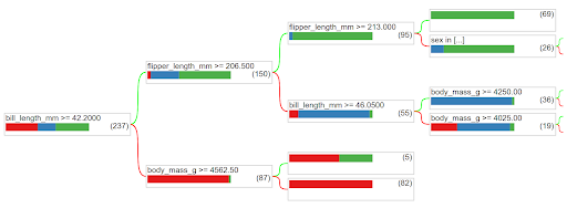 您可以直观地看到决策树结构。在该决策树中,第一个决策基于喙的长度。喙长超过 42.2mm 的企鹅很可能属于蓝色(巴布亚企鹅)或绿色(帽带企鹅)所表示的企鹅种类,而喙较短的企鹅很可能是红色(阿德利企鹅)所表示的企鹅种类。