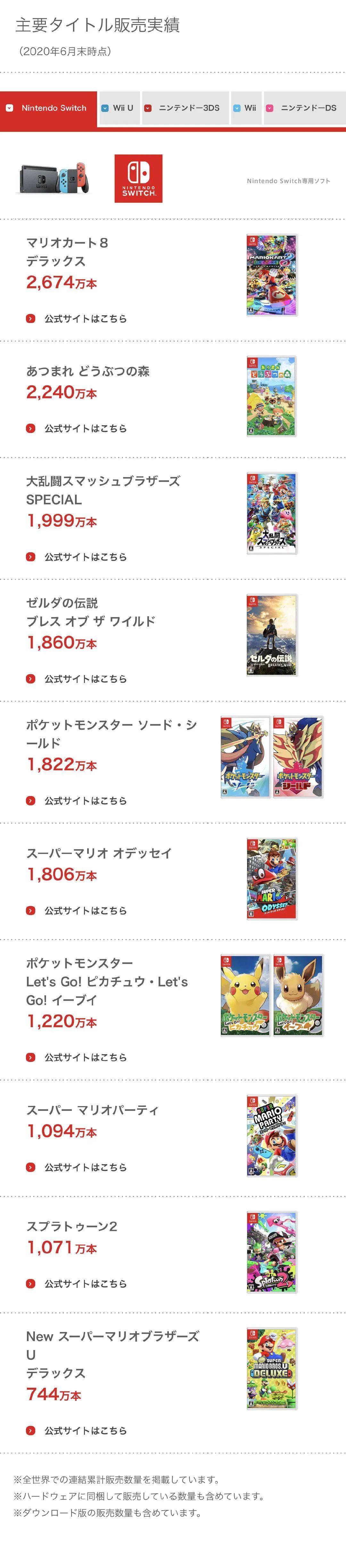 该平台上体感游戏的战况如何呢?根据任天堂官网公布的信息,截至2020年6月,Switch平台的游戏销量榜单前十全是传统游戏类型,大火的健身环却只有400多万的销量。