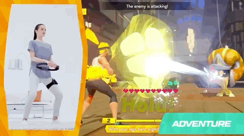 战斗中会运用Ring-Con和腿部固定带,配合身体的实际动作出招,各式各样的运动会化为攻击技术"健身技能"对抗敌人。面对敌人的攻击时,在腹肌上按压进行防御以减少伤害,可以说是用到全身来游玩这个游戏。
