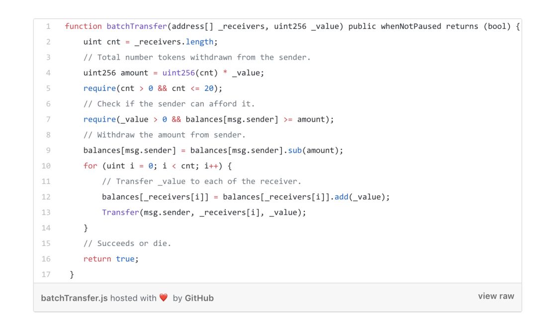 美链这个安全漏洞其实非常简单!美链智能合约中一个batchTransfer函数, 主要目的是实现BEC token的批量转账: 将固定整数数量(_value) 转账到一批接收账号的数组里 (_receivers). 为了实现这样的批量转账, BEC的开发人员, 首先计算需要转账的总金额, 计算的公式是: