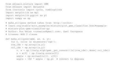 前面的简单例子里使用了一维高斯模型:即只有一个特征(身高)。但高斯不仅局限于一维,很容易将均值扩展为向量,标准差扩展为协方差矩阵,用n-维高斯分布来描述多维特征。接下来的程序清单里展示了通过scikit-learn的高斯混合模型运行聚类并对结果进行可视化展示。