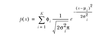 该公式和之前的公式非常相似,细节上有几点差异。首先分布概率是K个高斯分布的和,每个高斯分布有属于自己的μ和σ参数,以及对应的权重参数,权重值必须为正数,所有权重的和必须等于1,以确保公式给出数值是合理的概率密度值。换句话说如果我们把该公式对应的输入空间合并起来,结果将等于1。