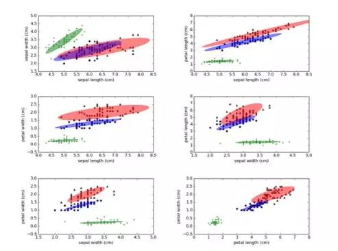 make_ellipses方法概念上很简单,它将gmm对象(训练模型)、坐标轴、以及x和y坐标索引作为参数,运行后基于指定的坐标轴绘制出相应的椭圆图形。