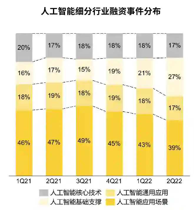 ,人工智能应用场景落地项目为投融资热门方向。2022 年上半年国内人工智能细分行业融资事件分布以应用场景为主。其中自动驾驶以及智能医疗作为其中的主要场景受到资本市场的广泛重视,累计贡献应用场景中近 40% 的融资事件。芯片半导体等硬件为代表的人工智能基础支撑方向获得资本市场的青睐,相关事件的占比从去年至今不断提高,截止到 2022 年第二季度贡献当季 27% 的投融资事件。