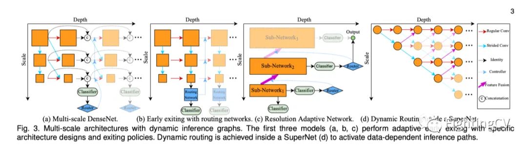 具有早期出口的多尺度结构。研究人员已经观察到,在链式结构网络中,多个分类器可能相互干扰,从而降低整体性能。合理的解释可能是,在常规CNN中,高分辨率特征缺乏对分类至关重要的粗略信息,导致早期退出的结果不令人满意。此外,早期分类器将迫使浅层生成任务专用特征,而部分常规信息丢失,导致深度出口性能下降。为了解决这个问题,多尺度密集网络(MSDNet)采用了:1)多尺度体系结构,由多个子网络组成,用于处理具有不同分辨率(比例)的特征图,以快速生成适合分类的粗略特征;2) 密集连接,以重用早期特征并提高深度分类器的性能(见上图(a))。基于多尺度架构设计,研究人员还研究了早期退出动态模型的退出策略(见图3(b))和训练方案。以前的方法通常实现网络深度的自适应。从利用特征中的空间冗余的角度来看,分辨率自适应网络(RANet,见上图(c))首先处理具有低分辨率特征的每个样本,而高分辨率表示根据早期预测有条件地使用。