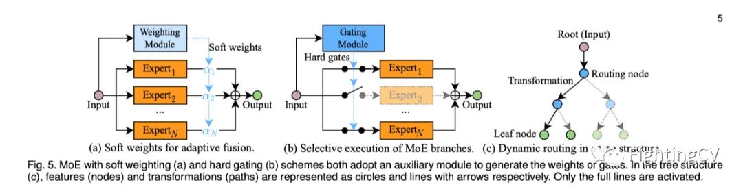 2) 在混合专家(MoE)中跳过分支。提高模型容量的另一种方法是MoE结构,这意味着多个网络分支作为专家并行构建。可以有选择地执行这些专家,并将其输出与数据相关权重融合。(如上图(a)和(b)所示)