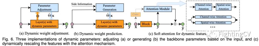 参数自适应的典型方法是根据推理期间的输入调整权重,如上图(a)所示。这种实现通常需要很少的计算来获得调整,例如注意力权重或采样偏移量。