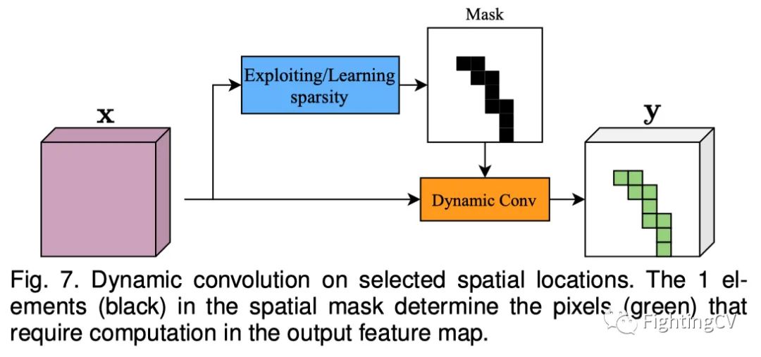 动态稀疏卷积。为了减少信息量较小位置上的不必要计算,只能对策略采样的像素执行卷积。现有的采样策略包括1)利用输入的固有稀疏性;2) 预测零元素在输出上的位置;和3)估计像素的显著性。典型的方法是使用额外的分支生成空间掩码,确定每个像素上卷积的执行(如上图所示)。