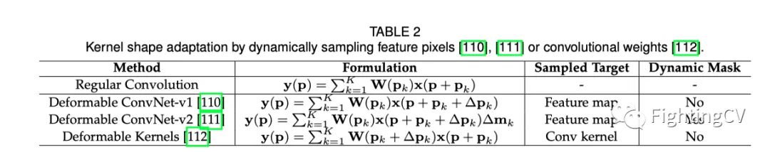 Kernel shape adaptation。除了自适应地缩放权重值外,还可以实现参数调整以reshape卷积核并实现动态感受野。基于这个方向,当对每个像素执行卷积时,可变形卷积从自适应位置采样特征像素。下表展示了不同动态采样像素点的方法。