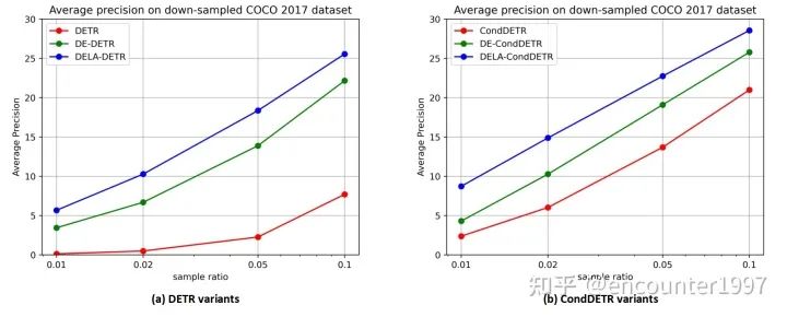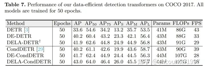 尽管以上实验说明了我们的方法能够在数据量有限的情况下显著提升模型性能,它并不能表明我们的方法在数据量充足时依然有效。为此,我们在数据量充足的COCO2017上测试我们方法的性能。有趣的是,我们的方法不仅不会降低模型在COCO 2017上的性能,还能带来不小的提升。具体来说,DELA-DETR和DELA-CondDETR分别相较于它们的baseline提升8.1AP和2.8AP。