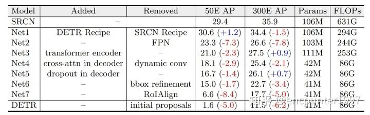 表1:从SparseRCNN(表中缩写为SRCN)到DETR的模型转化