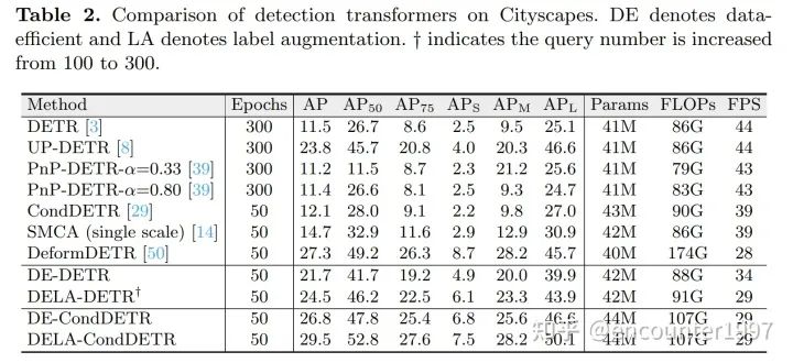 目前的研究似乎表明Detection Transformers能够在性能、简洁性和通用性等方面全面超越基于CNN的目标检测器。但我们研究发现,只有在COCO这样训练数据丰富(约118k训练图像)的数据集上Detection Transformers能够表现出性能上的优越,而当训练数据量较小时,大多数Detection Transformers的性能下降显著。如图1所示,在常用的自动驾驶数据集Cityscapes[8](约3k训练图像)上,尽管Faster RCNN能够稳定的取得优良的性能,大多数Detection Transformers的性能显著下降。并且尽管不同Detection Transformers在COCO数据集上性能差异不到2AP,它们在小数据集Cityscapes上的性能有大于15AP的显著差异。