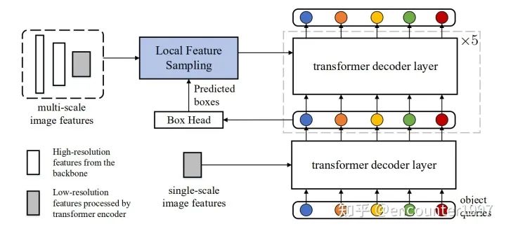 局部特征采样。从模型转化中的分析中可以看出,从局部物体区域做特征采样对实现数据效率是至关重要的。幸运的是,在Detection Transformer中,由于Deep Supervision[12]的存在,每一层解码器层中都为我们提供了物体检测框的信息。因此,我们可以在不引入新的参数的情况下,借助这些物体定位框来做局部特征采样。尽管可以采用更成熟的特征采用方法,我们采用最常用的RoI Align。从第二层解码器层开始,我们借助前一层解码器的输出来做稀疏特征采样。