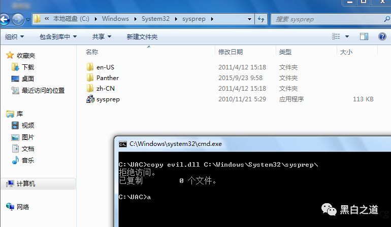 部分方式需要我们将DLL文件拷贝到相应的目录,这里拿Sysprep来做测试,要往这个目录拷贝文件需要管理员的权限,直接copy是不可以的,本文介绍的脚本使用了第二种方式,下面是一个测试。