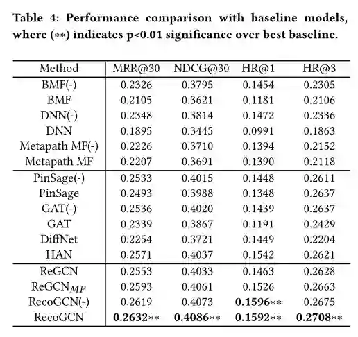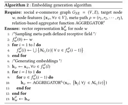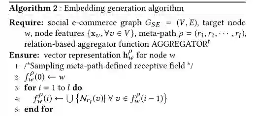 在本文中,我们研究了一种新兴的场景,即社交电子商务中的推荐系统设计。我们提出了一种基于关系感知的协同注意GCN推荐模型RecoGCN,以有效地收集HIN中的异构特征来生成推荐所需的节点嵌入。RecoGCN设计了三个新颖的组件:1)显式建模异构关系语义的关系感知聚合器;2)元路径定义的感受野采样器(节点邻域的采样),它有效地划分出简明和语义相关的感受野;3)协同注意的嵌入融合机制,动态推理购买背后的复杂动机。大量的实验表明,所提出的RecoGCN能够学习社交电子商务网络中有意义的节点嵌入,并且在性能上比所有基线方法都有显著的提高。未来重要的工作将是识别RecoGCN对推荐系统中下游评分功能的影响,并探索自动搜索最佳元路径的可行性。