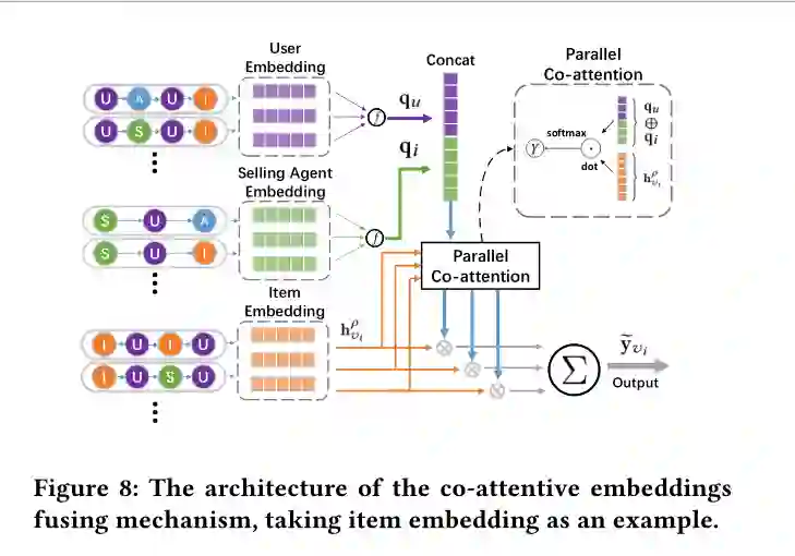 我们设计了一个由元路径定义的感受野采样器。它从多跳邻域中提取出简洁且语义相关的感受野。并且,我们设计了一个协同注意力机制去动态融合从不同元路径中学习的节点嵌入。它对每个购买决策背后的主要动机进行推理,并更准确地对交互反馈进行建模。