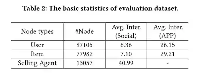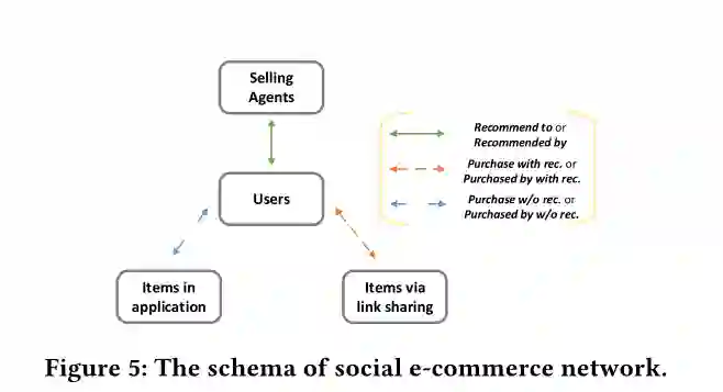 社交电子商务网络可以被考虑为传统HIN的一种。特别的,我们定义了四种类型的节点,分别对应于销售智能体、用户、通过链接共享的商品和移动APP中的商品,以及6个类型的边,表示它们之间的各种类型的关系。注意,通过链接共享的商品和移动APP中的商品指的是相同的实体,但是用户与它们的交互具有不同的含义(受销售智能体的影响与不受销售智能体的影响)。因此,为了清楚起见,我们将它们分为两种虚拟类型的节点。