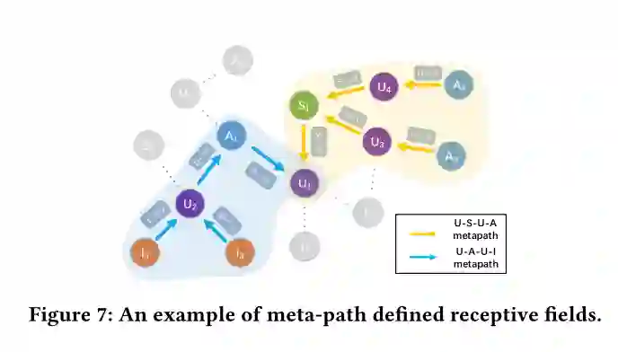 在上图中,对节点U_1采样了两个基于元路径U −S −U −A与U − A −U − I的感受野,标记为黄色区域与蓝色区域。可以观察到与传统的3跳感受野中的15个节点相比基于元路径的感受野节点数量减少到了5。