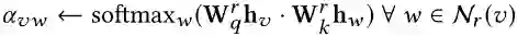 1)首先将目标节点及其邻居的嵌入分别转换为具有单独的可训练权重W^r_q和W^r_k的查询向量和键向量。