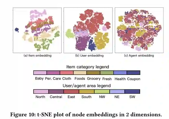我们可以观察到项目的分布与类别密切相关,属于相同类别的项目很可能相互聚集。同时,用户的嵌入也可能根据他们的地区进行聚合。不过,在销售智能体中聚合现象并不明显。