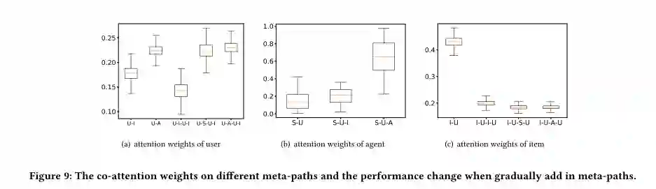 为了研究哪些元路径在预测用户购买决策中起重要作用,我们对比了不同元路径之间的注意力权重,如图9所示。