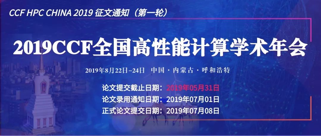 CCF HPC CHINA 2019将于2019年8月22日至24日在内蒙古呼和浩特召开。论文提交截止日期:2019年05月31日