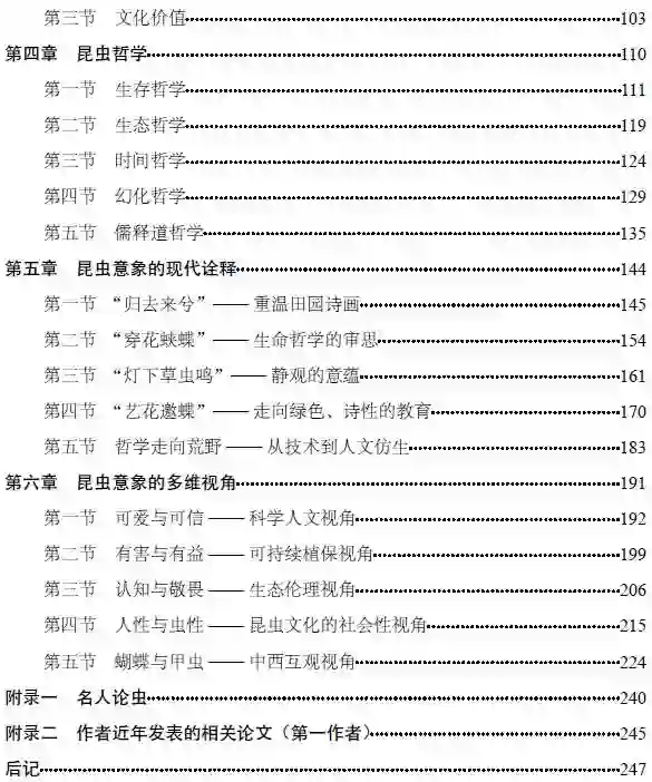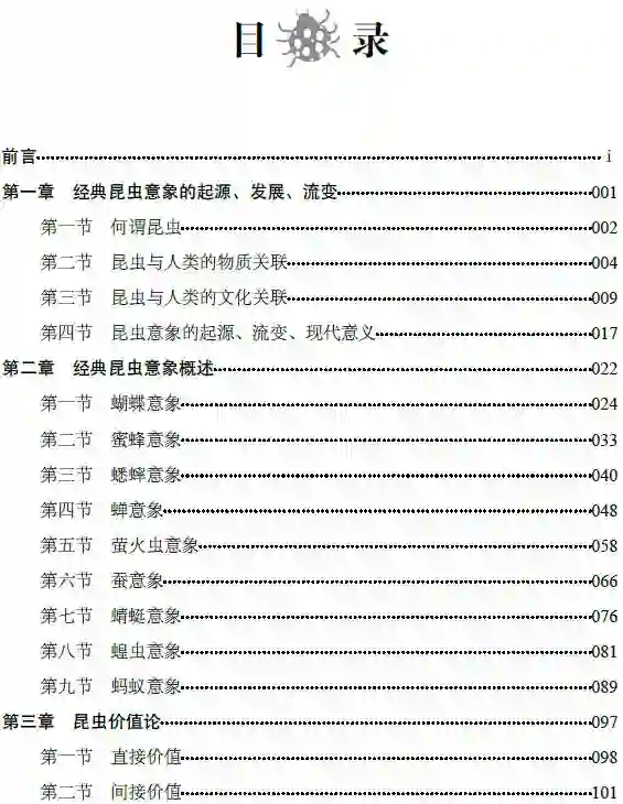 《昆虫意象的哲学观照》共分六章,第一章主要是纵向源流梳理,阐释经典昆虫意象的起源、发展、流变;第二章,横向展开,从历代经典诗歌中,凝练昆虫意象的内涵,阐释诗意背后的科学;第三章是昆虫价值论,主要从物质与文化,直接与间接两方面论述昆虫的多元价值;第四章阐释昆虫文化的哲学内涵;而第五章(昆虫意象的当代诠释)与第六章(昆虫意象的多维视角)应该是第三、第四章的纵向提升与横向绵延。如果说,这本小书有何中心思想,那就是:小小昆虫,大有乾坤;以虫为鉴,可察天地之道。本书适合普通高等院校的本科生阅读,也可供对昆虫科学、科学人文化与昆虫文化的有兴趣的读者阅读使用。