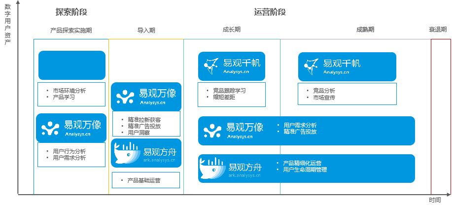 上面3个案例是根据不同银行特征提供不同的解决方案,其实易观也会根据不同的产品周期来提供不同的解决方案。在实现数字化用户触点以后,就是产品的数字化,意味着整个产品的生命周期,从探索到导入成长流程的阶段需求都是不一样的。