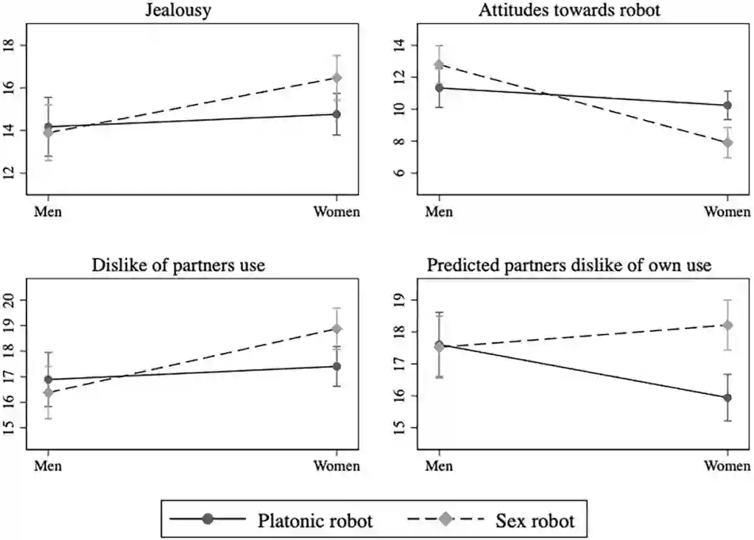 为此,Arnestad 博士进行了一项研究,在这项研究中,有163名女性和114名男性参与者阅读了一个短故事,内容涉及一个纯粹为性爱或柏拉图式爱情而设计的高度逼真的机器人,然后填写问卷调查,询问他们如果伴侣拥有和使用这种机器人会如何反应,以及他们如何思考如果他们自己与这种机器人一起使用,他们的伴侣会做出反应。