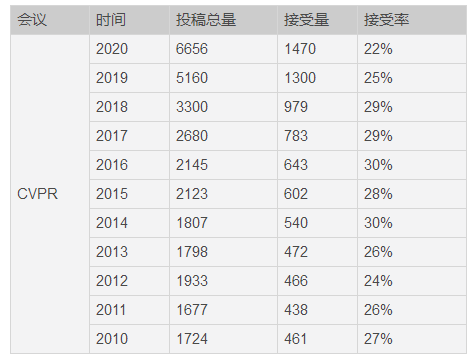 以CVPR为例,作为计算机视觉领域的顶级学术会议,2020年共收到了 6656 篇有效提交论文,共接收了 1470篇论文,接收率接近 22%。
