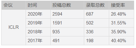 ICLR录用率则是四连降,从2017年的40.4%的论文接受率到2018年的35.9%,再到2019年的31.55%,最后2020年的录用率是26.48%。相比投稿数据的逐年成倍数的递增,与接受率形成鲜明的对比。