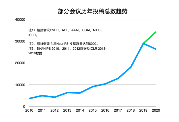 但是从上图,我们可以看出,在假设NeurIPS 2020投稿量达到8000篇的时候,似乎会出现一个小的拐点。虽然在2017年的时候,NIPS程序主席笑称注册参会者将会超过全球人类数量,但事实是搞AI科研的人数总是那么多,在增长到一定幅度之后,就会达到饱和。