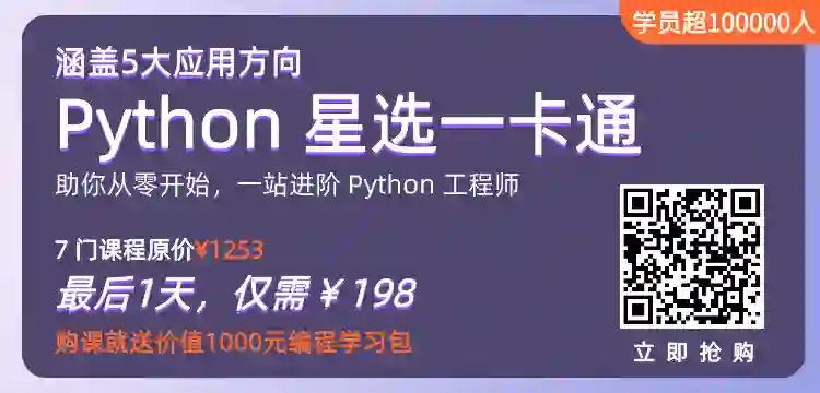 基于此,我们联合 7 位 Python 经验丰富的工程师,专为Python新手量身打造了这门<Python入门到实战-星选一卡通>套餐课,带你通过正确的学习路径,从零开始学习并实践 Python 5 大热门应用方向。