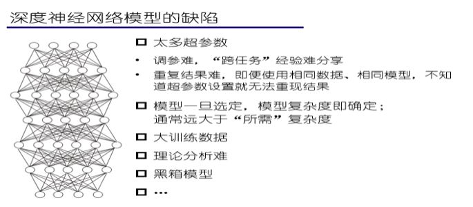 最近如果大家关心深度学习方面的一些前沿研究,可能就会发现现在有大量的论文是关于模型压缩、模型简化等等,事实上都是由这个原因导致的。我们能不能在使用模型的最初不要使用那么复杂的东西?先使用一个比较简单的,然后随着数据和训练的过程让它自适应地、自动地提升复杂度呢?很遗憾,我们对神经网络很难做到这一点,因为我们一旦用BP算法基于梯度搜索来做这件事情,如果事先结构都完全不知道,那么求梯度的对象也就不知道了。