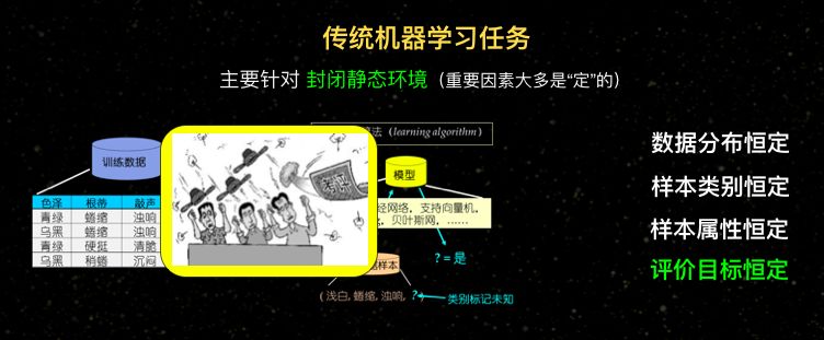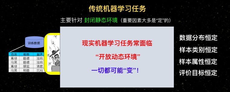 机器学习现在取得胜利,基本上都是在封闭静态环境里面。我们要假定很多东西都是固定的,比如我们要假定所有的数据都来自于独立同分布,数据分布恒定。