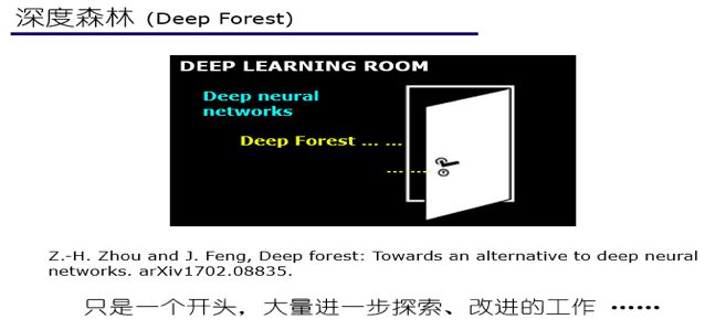 最近我们的课题组做了一些研究,提出了一个新的模型叫做“深度森林”,这是不基于神经网络来做的模型,它的基本构件是决策树,本身是不可微的,所以不能用BP训练,模型复杂度可以自己根据数据调整,超参数比深度神经网络要小。除了大规模的图像类任务之外,很多的任务上它的性能已经达到或者接近了深度神经网络的性能。从学术上来说,特别值得关注的就是它是第一个非神经网络,不使用BP算法训练的深度学习模型。