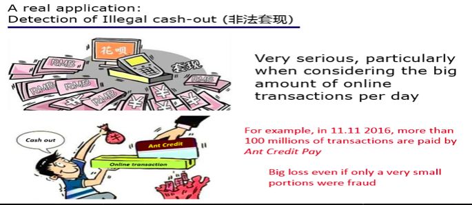 比如最近我们和国内一个非常大的互联网金融公司合作,做在线支付的非法套现检测。这个公司非常大,大家每天都在接触它,每天有大量的网上交易,比如在2016年“双11”这一天,一天就有1亿多交易是通过网上支付来做的。非法套现是一个很大的问题。